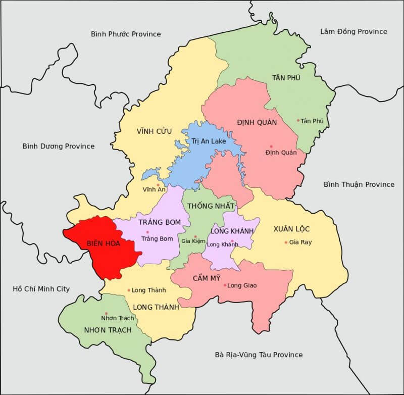- 9 Huyện: Long Thành, Nhơn Trạch, Trảng Bom, Thống Nhất, Cẩm Mỹ, Vĩnh Cửu, Xuân Lộc, Định Quán, Tân Phú.