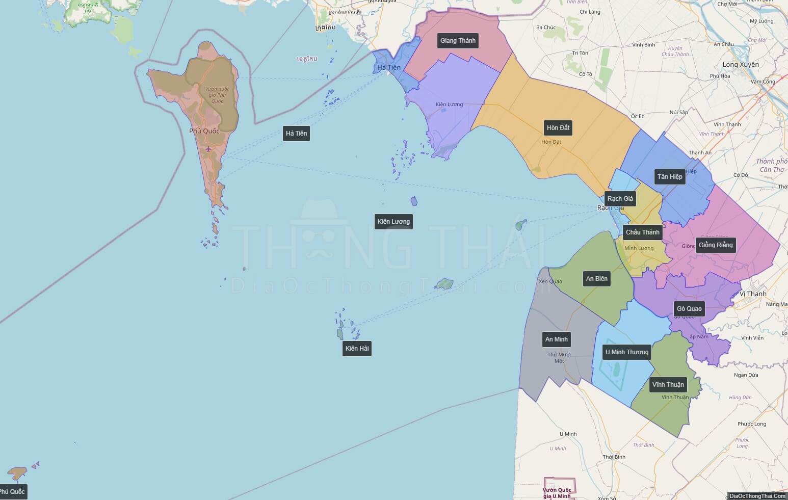 - 12 Huyện: Kiên Lương, Hòn Đất, Giồng Riềng, Gò Quao, Châu Thành, Tân Hiệp, An Biên, An Minh, Vĩnh Thuận, U Minh Thượng, Kiên Hải, Phú Quốc
