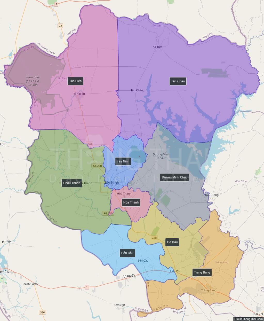 - 8 Huyện: Trảng Bàng, Gò Dầu, Bến Cầu, Hoà Thành, Châu Thành, Dương Minh Châu, Tân Biên, Tân Châu.