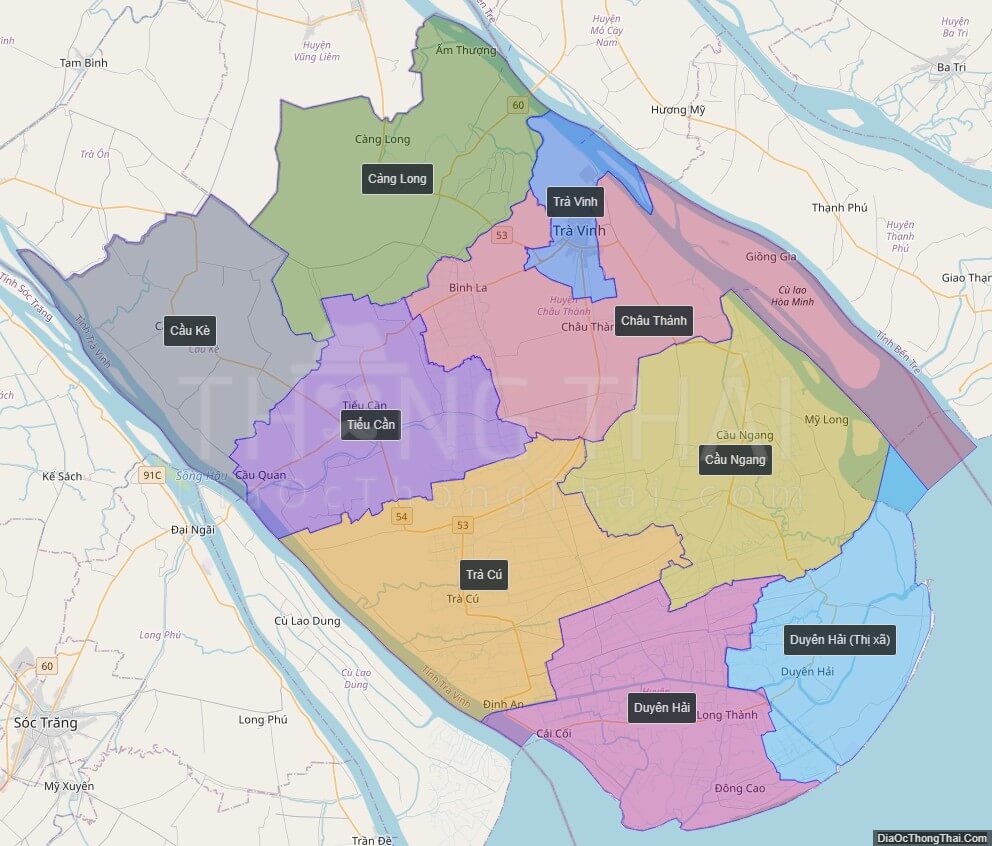 - 6 Huyện: Càng Long, Cầu Kè, Cầu Ngang, Châu Thành, Duyên Hải, Tiểu Cần, Trà Cú.